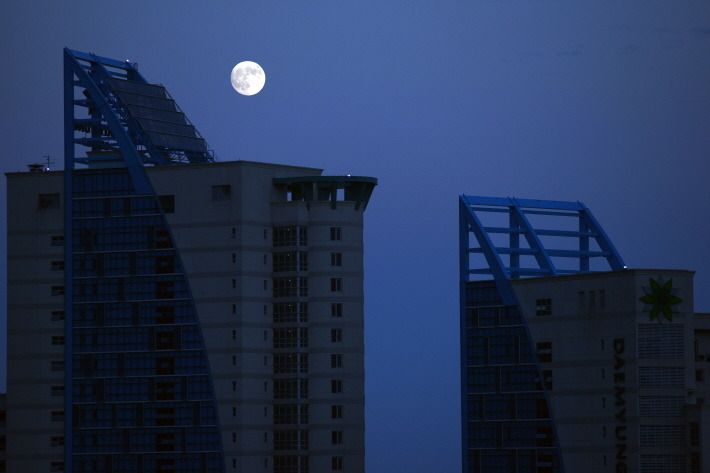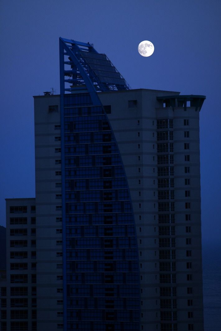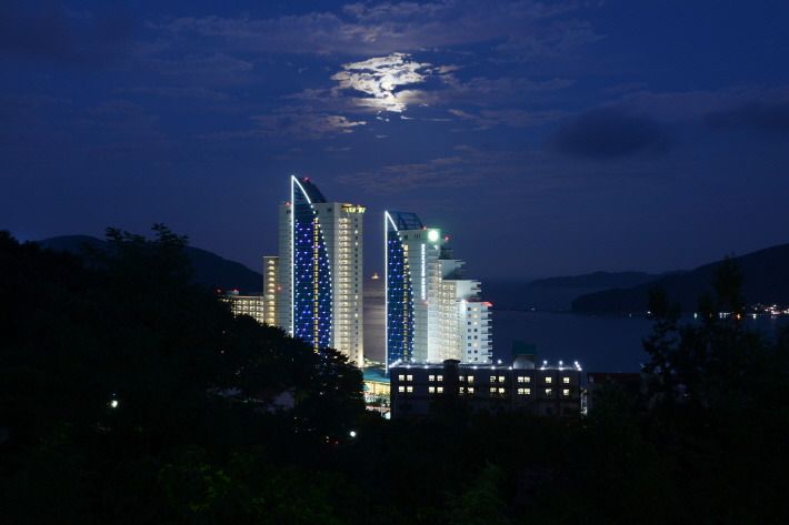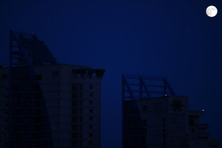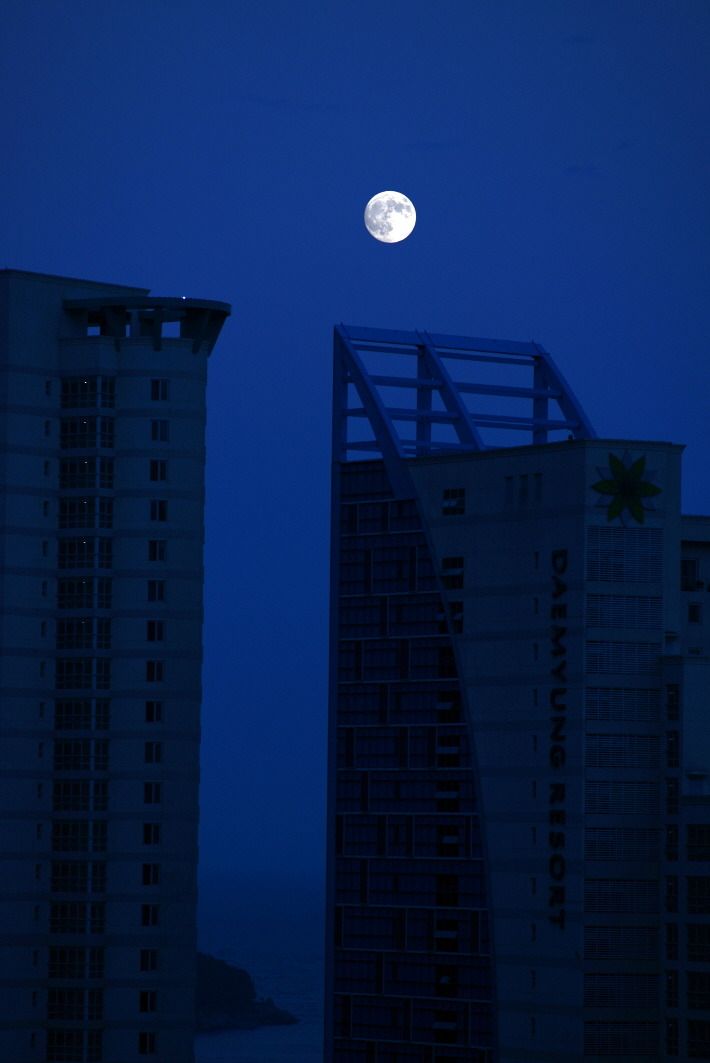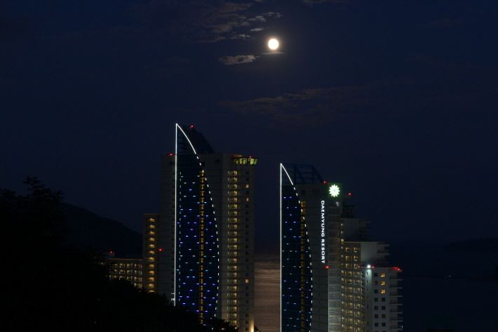 건물 위로 살짝 내려앉은 보름달은 리조트의 불빛과 함께 환상적인 모습을 연출합니다.