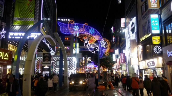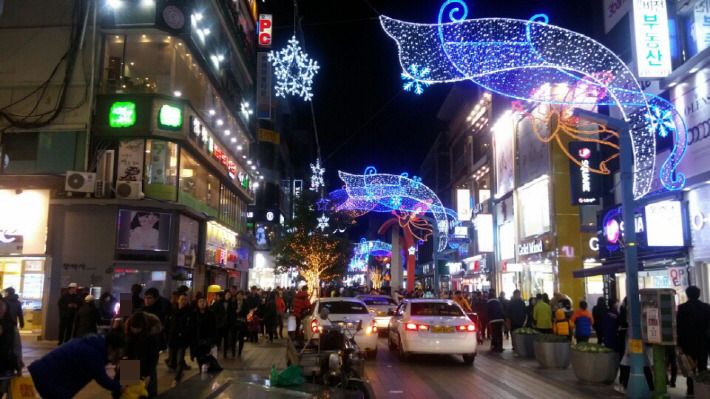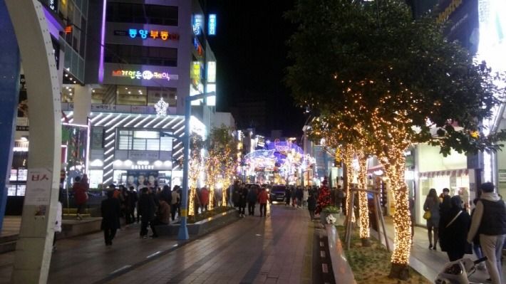 광복로에 크리스마스트리가 세워졌고, 휘황찬란한 등불이 거리를 환하게 밝히고 있습니다.