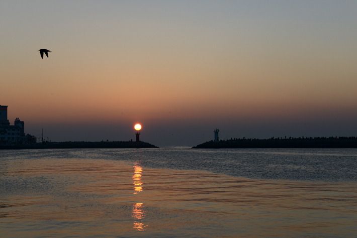 거제도 장승포항에서 떠오르는 장엄한 일출.