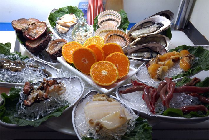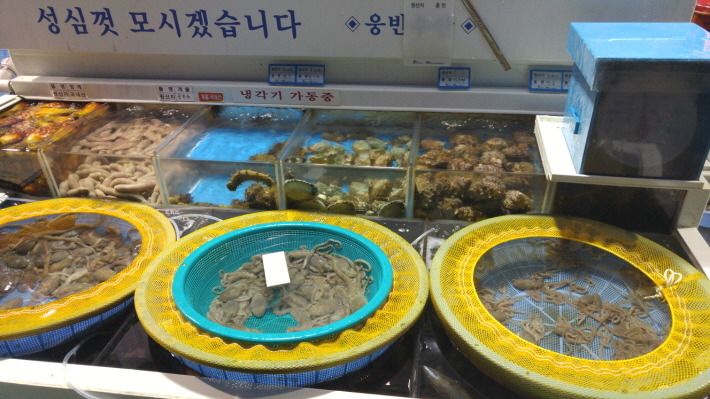 싱싱한 해산물이 수족관에 넘쳐나고 있습니다.