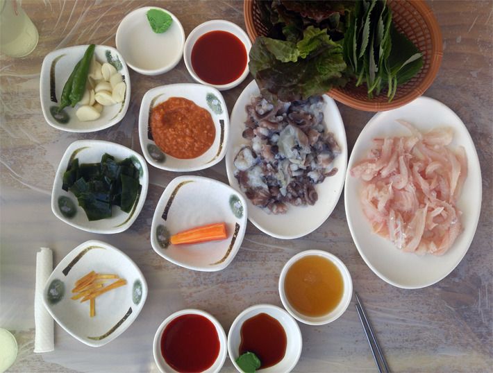 창가에 자리를 앉으니 초장과 상추 등 간단한 찬거리를 제공합니다.
