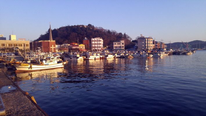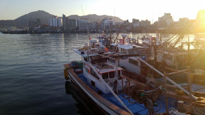 통영항에 정박한 어선을 배경으로 한 풍경이 그렇게 좋을 수 없습니다.