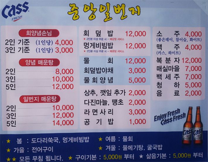 회 양념은 2인 기준으로 1인당 4천 원, 3인 기준으로 1인당 3천 원입니다.