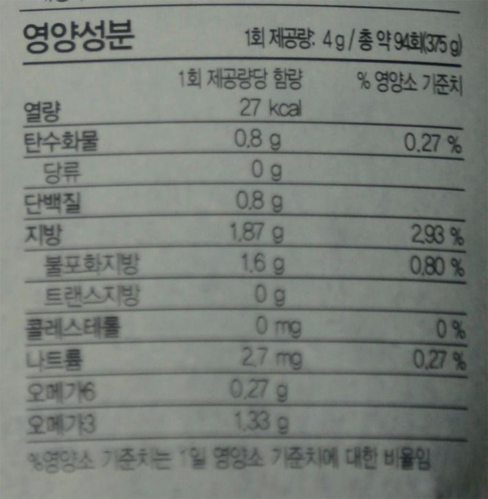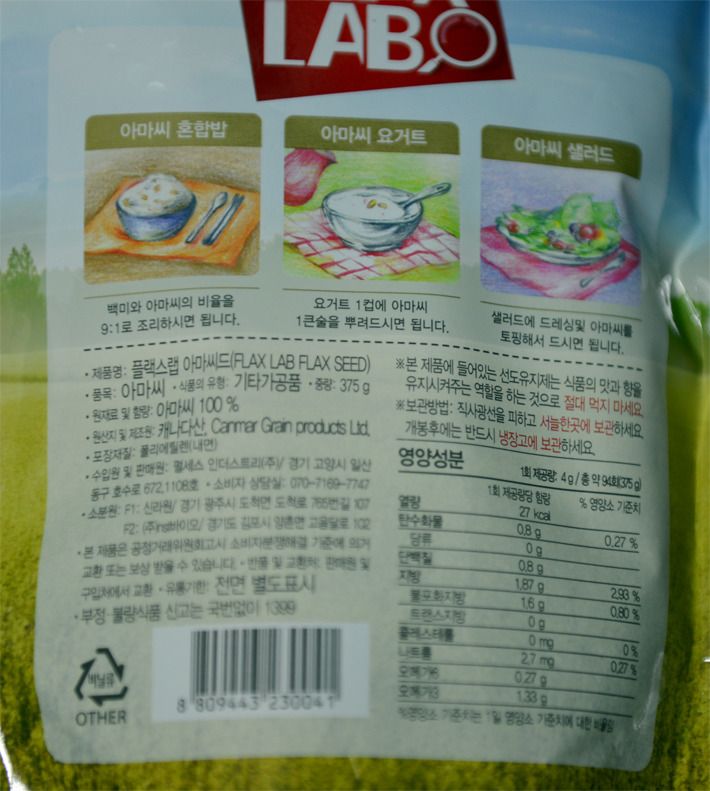 아마씨 봉투에 고지한 먹는 방법과 영영성분 내용입니다.