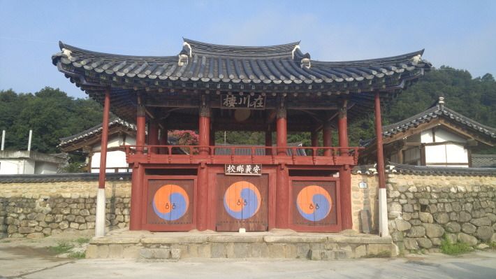 [함양여행] 돌 담 구멍사이로 본 안의향교 명륜당 편액과 정문에 선 위엄과 권위를 상징하는 누각 재천루/함양여행코스/함양가볼만한곳/경상남도문화재자료 제226호 안의향교