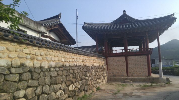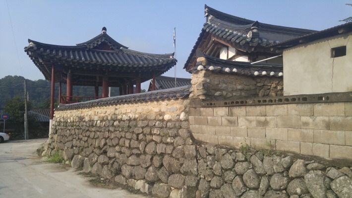 [함양여행] 돌 담 구멍사이로 본 안의향교 명륜당 편액과 정문에 선 위엄과 권위를 상징하는 누각 재천루