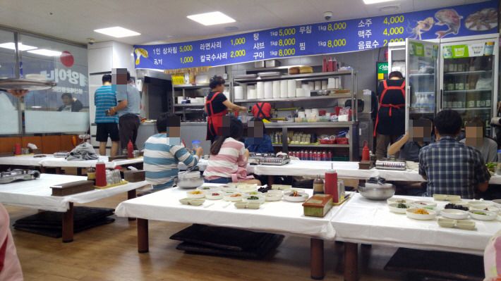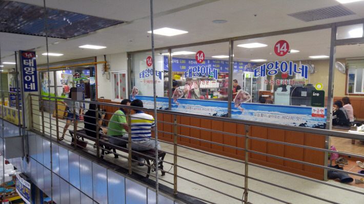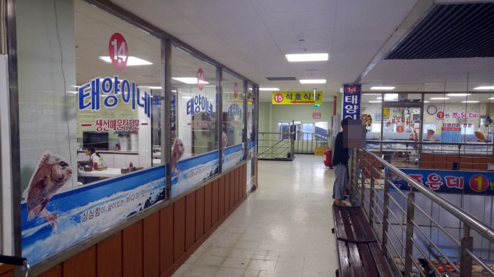 1층 넓은 수산물 시장을 한 바퀴 돌아 소개 받은 2층 '태양이네' 식당으로 갔습니다.