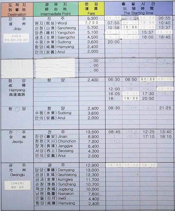 거창버스터미널에 게시된 전국으로 가는 버스시간표와 요금표입니다.