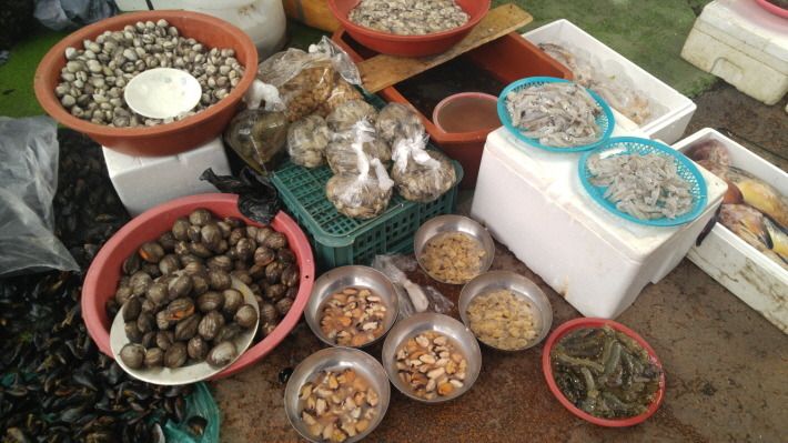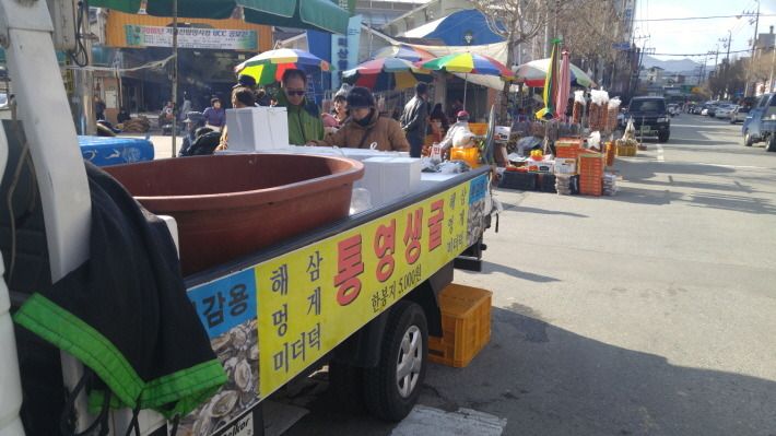 통영에서 올라온 수족관 차량에는 해삼과 굴을 봉지에 담아 판매합니다.