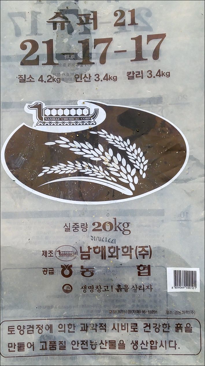 무기질비료인 복합비료(21-17-17) 20kg 짜리 한 포도 뿌렸습니다.