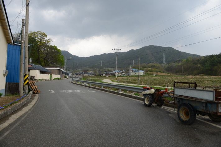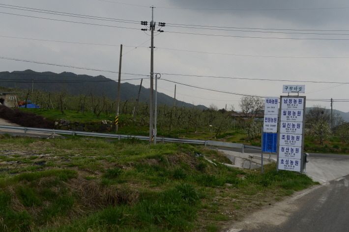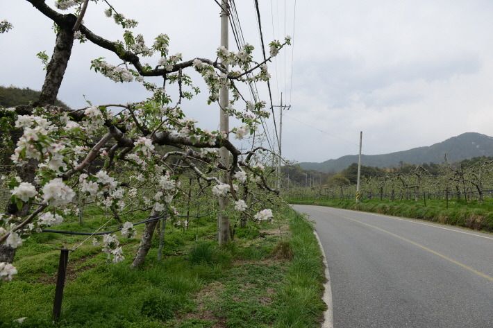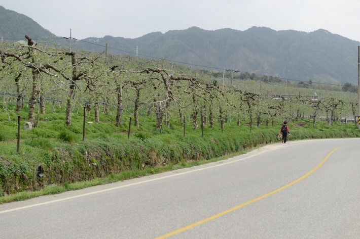 수동사과꽃축제가 열리는 수동면 도북마을은 도로를 따라 양쪽으로 사과밭입니다.