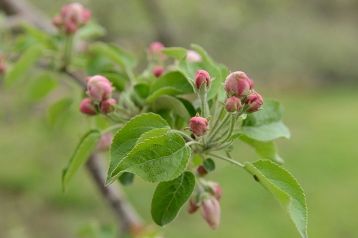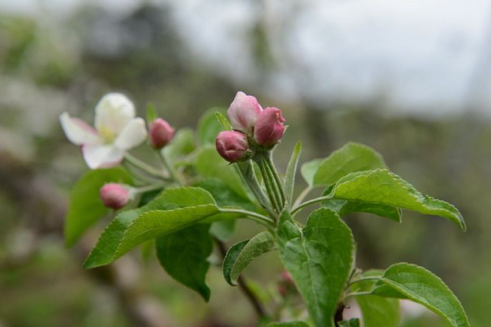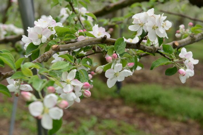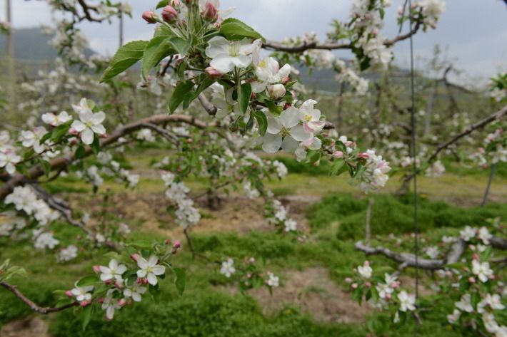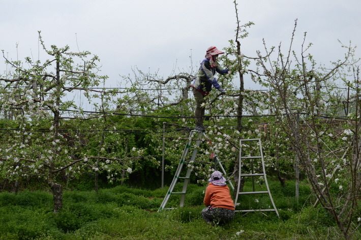 지금 사과 밭은 적정한 사과 열매를 맺도록 꽃따기 작업이 한창입니다.