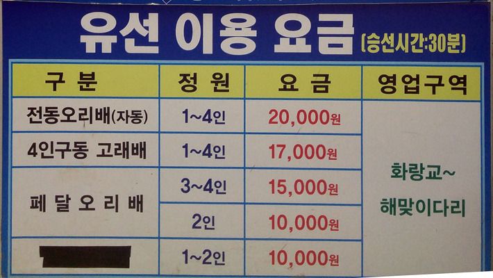 요금은 승선시간 30분에 전동오리배(자동) 1~4인용은 20,000원, 4인구동 고래배(1~4인) 17,000원입니다.