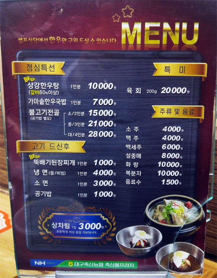 . 메뉴 : 소고기 요리/상강한우탕/가마솥한우국밥/불고기 전골/뚝배기 된장찌게/냉면/소면/육회