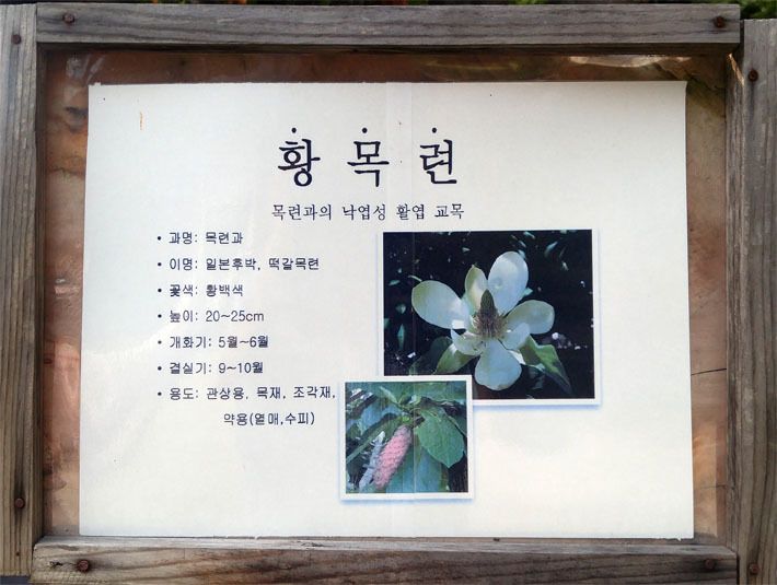 무슨 나무인가 궁금해서 나무 이름표를 보니 '황목련'이라 쓰여 있다.