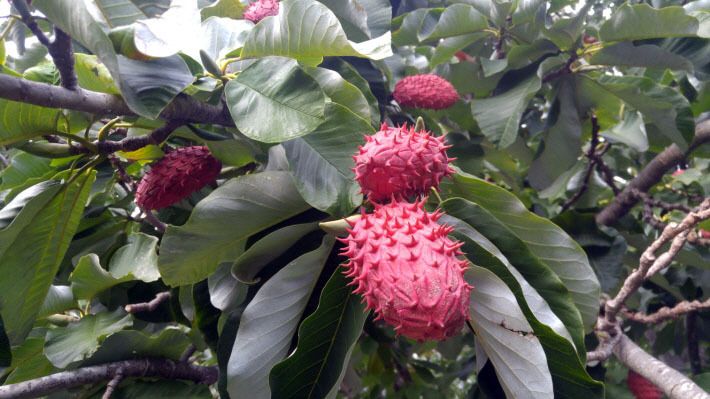 열매는 크기 15cm 내외로 타원형으로 생겼으며, 붉은 자색으로 돌기가 나 있다.
