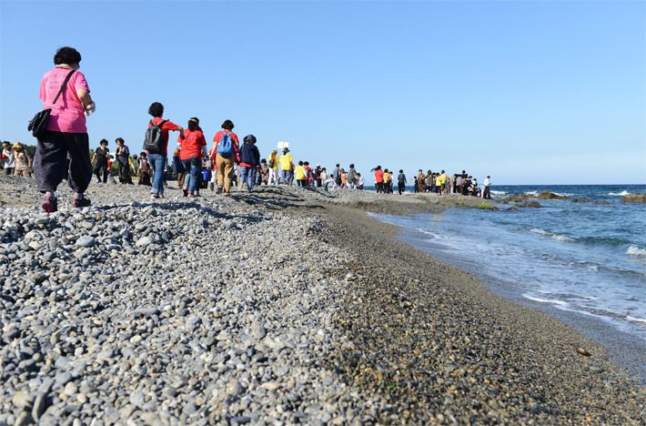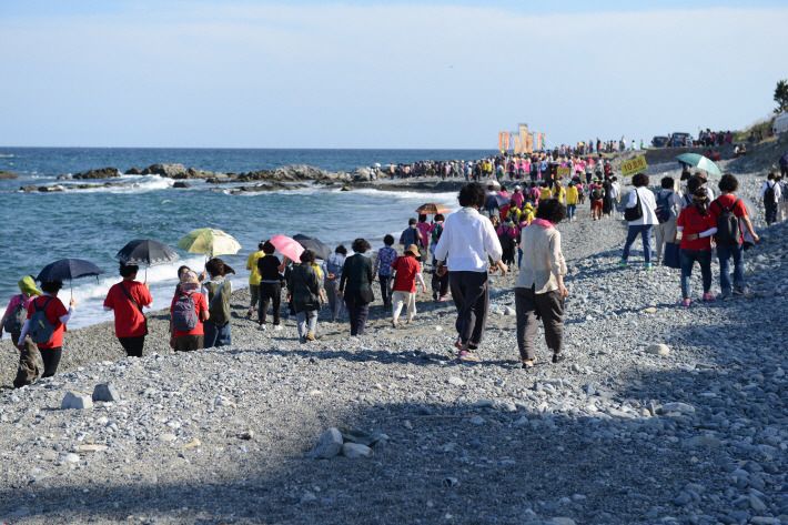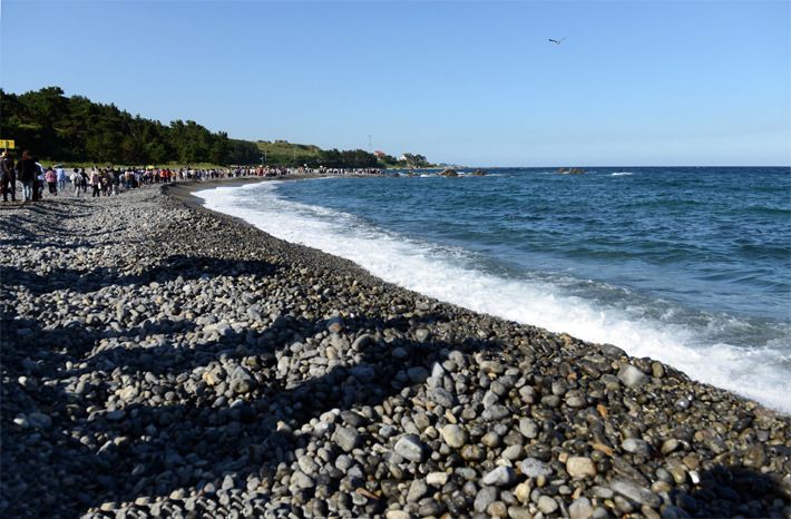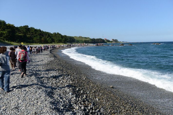 세찬 파도가 치는 바닷가 자갈밭을 걷는 사람들.