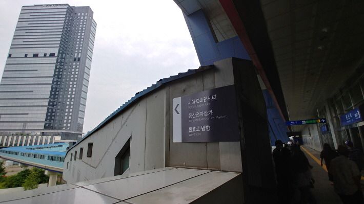 복도를 따라 가다보면 왼쪽으로 높은 빌딩이 보이고 갈림길이 나타나는데, 서울드래곤시티, 용산전자상가, 원효로 방향이라는 안내 표지판을 볼 수 있습니다.