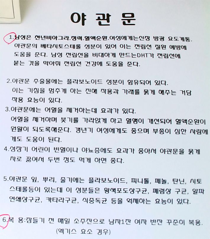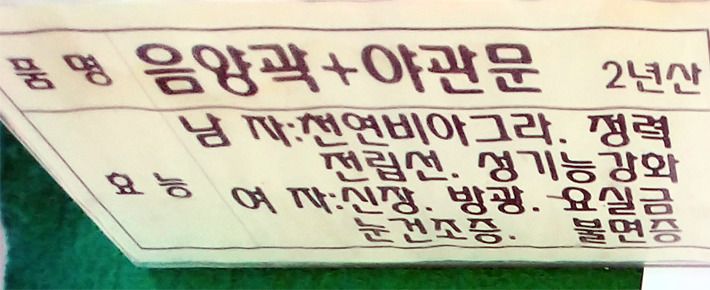 이밖에 상점에 붙여놓은 안내문에는 야관문의 또 다른 효능이 적혀 있습니다.