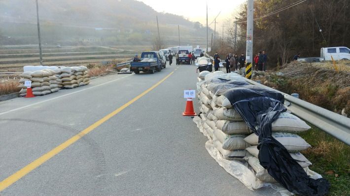 면사무소와 농협에서는 커피와 어묵을 준비하고 농민들을 위로 격려하는 모습이다.
