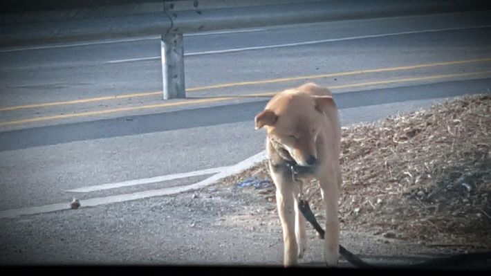개 한 마리가 길에 서서 허공을 응시하고 있다.