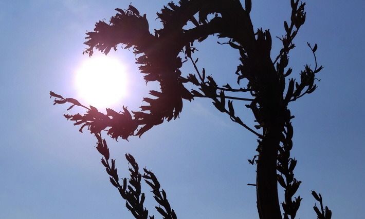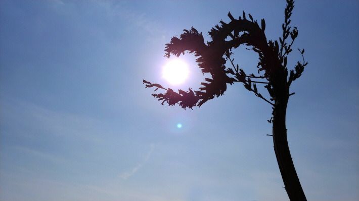 휘어진 풀 속에 태양이 자리한 사진.