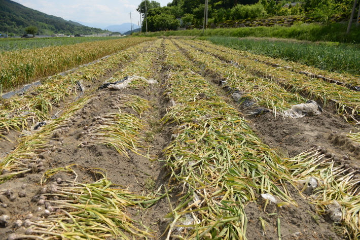 함양 마늘은 지리산 주변의 기후 조건으로, 생육 환경이 좋아 마늘이 굵고 건실하여 맛이 좋기로 유명합니다.