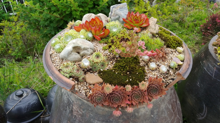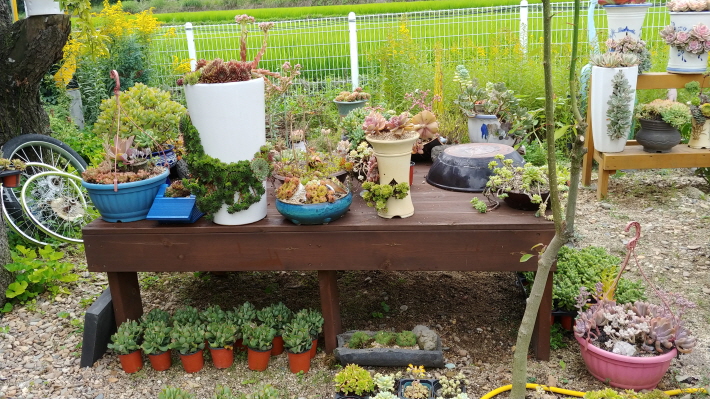 특히, 장독대는 드릴로 구멍을 뚫거나 일부분을 깨서 그 공간에 다육식물을 심어 꽃을 피우고 있다.(장독대 구입비용만도 만만치가 않아 보인다. ㅎㅎㅎ)