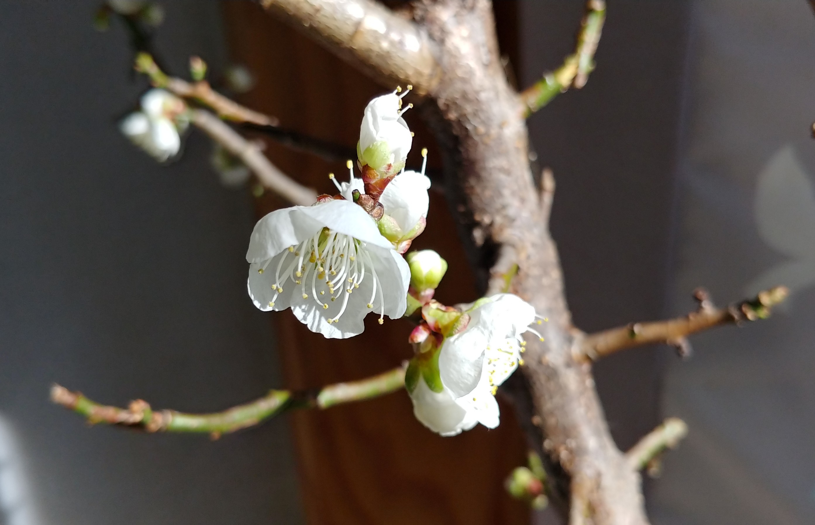 가지를 꺾어 물을 담은 항아리에 담아 집안에 두었더니만 꽃을 피웠습니다.