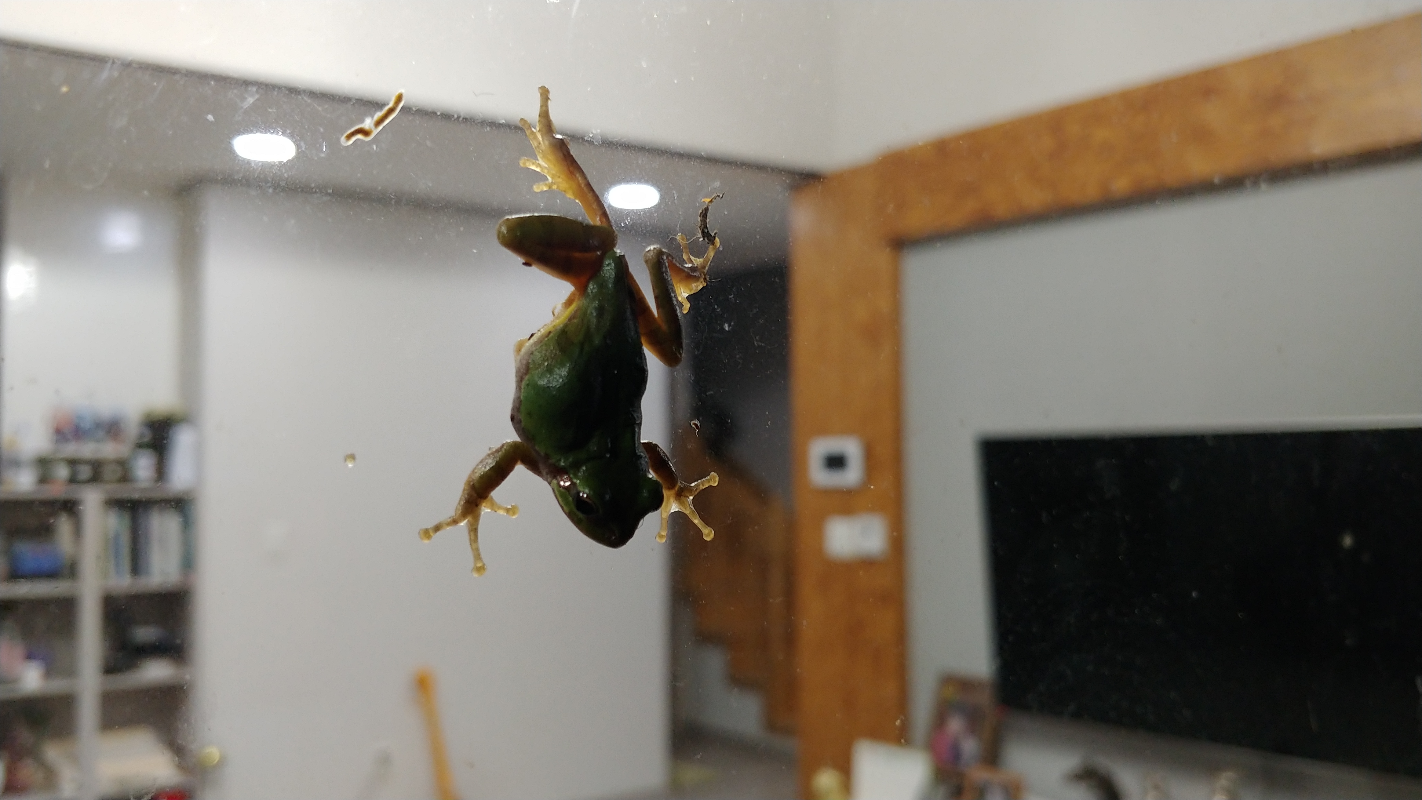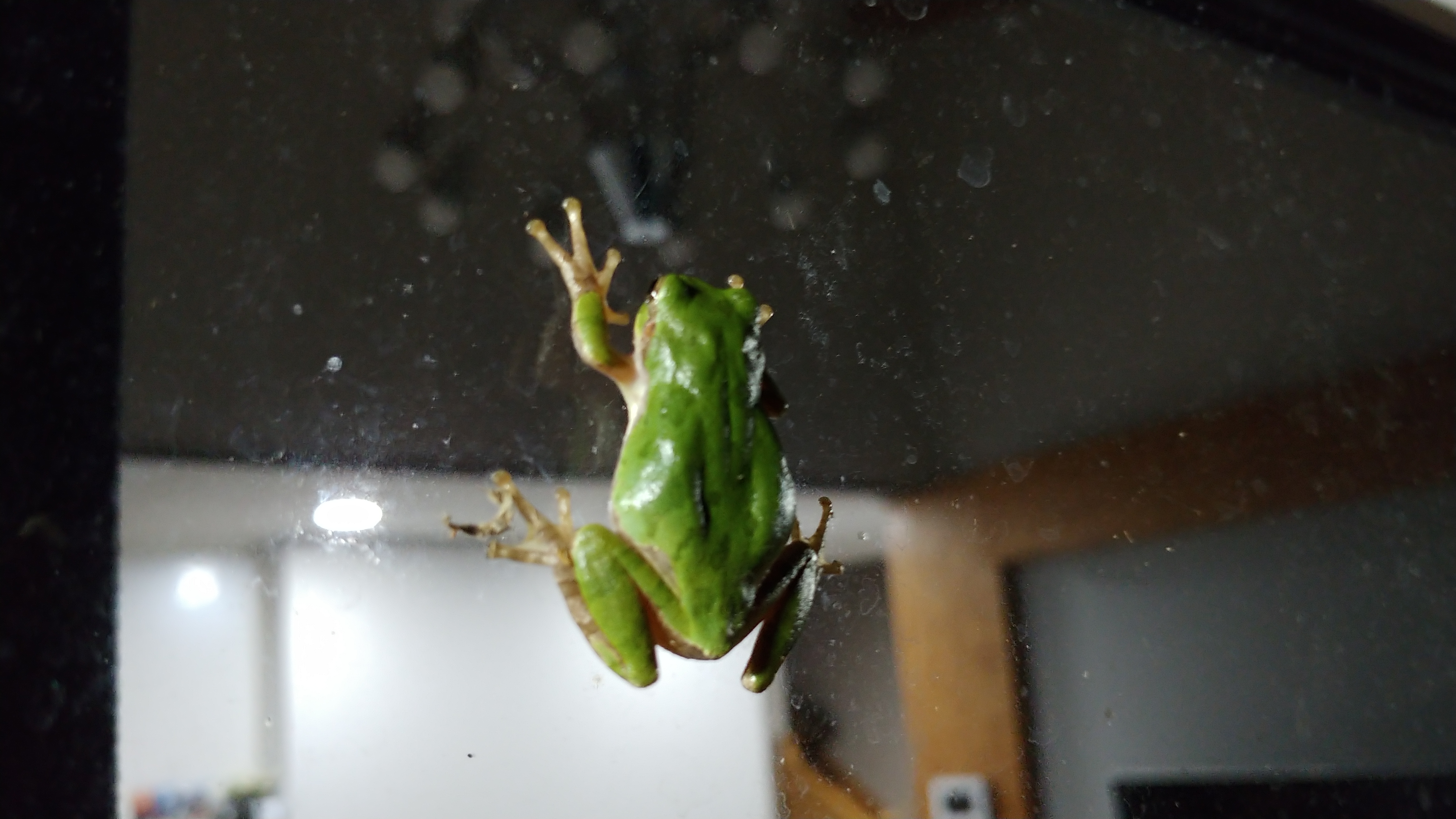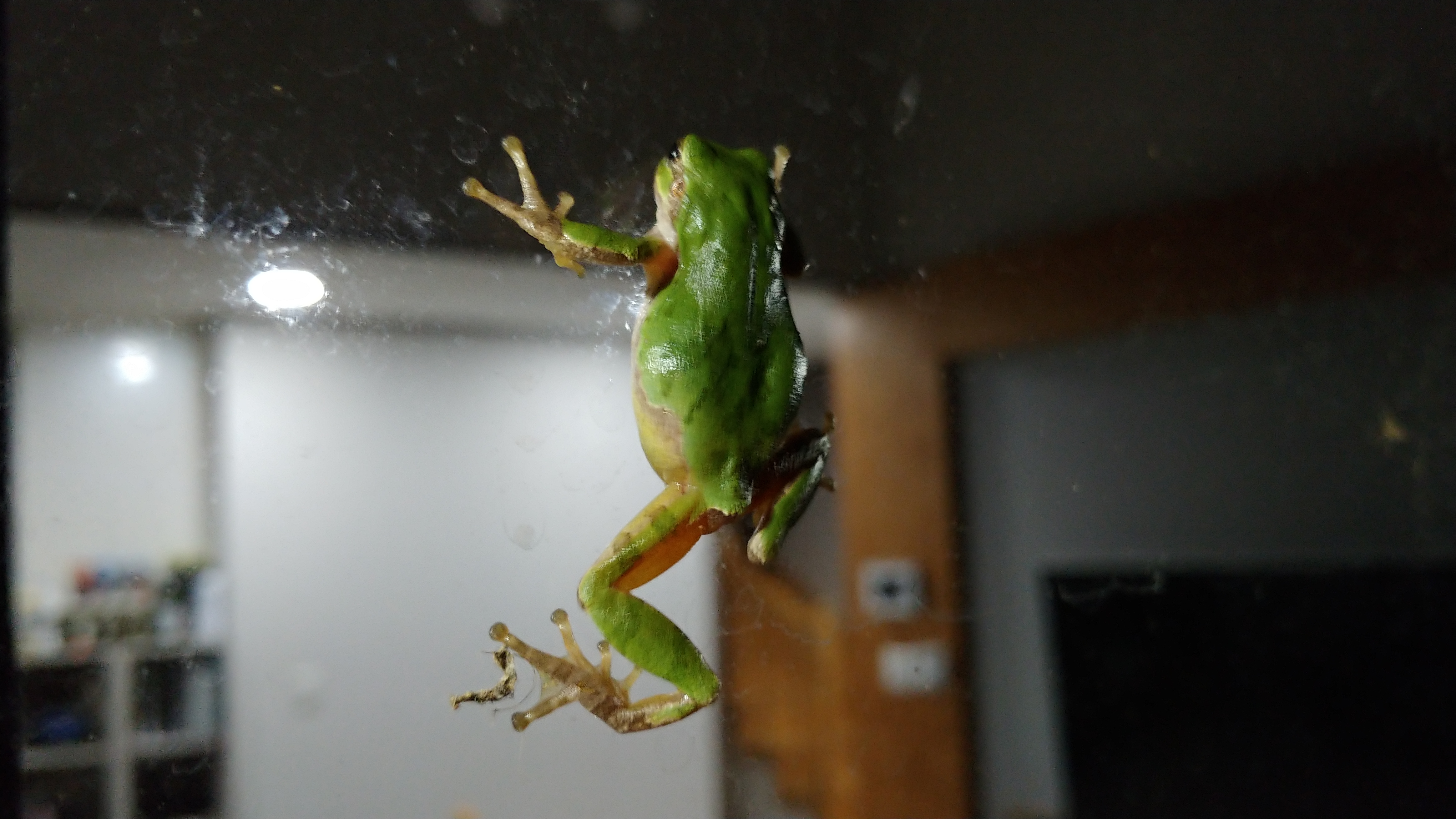청개구리 한 마리가 거실 유리창에 붙어 기어 오릅니다.