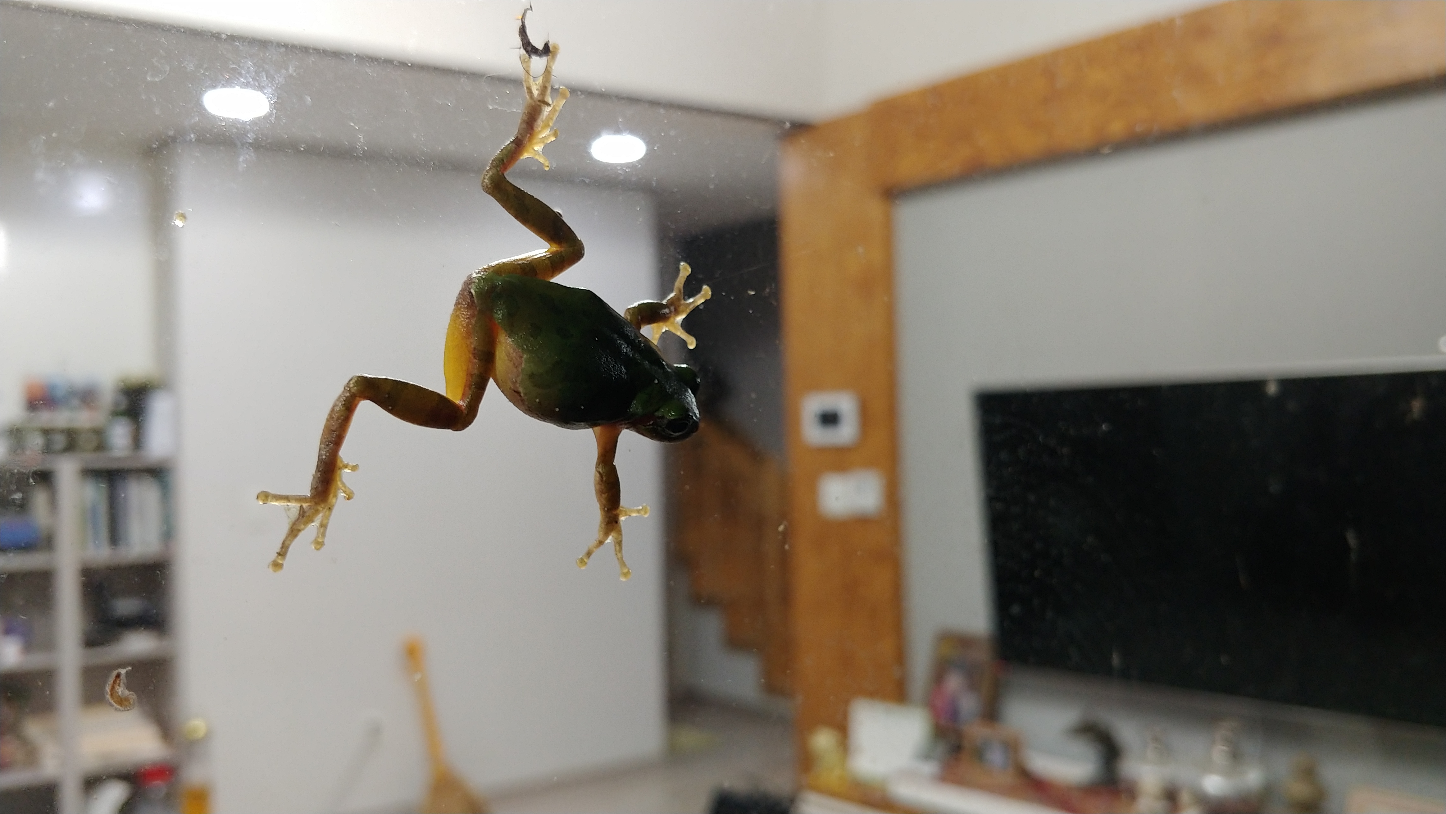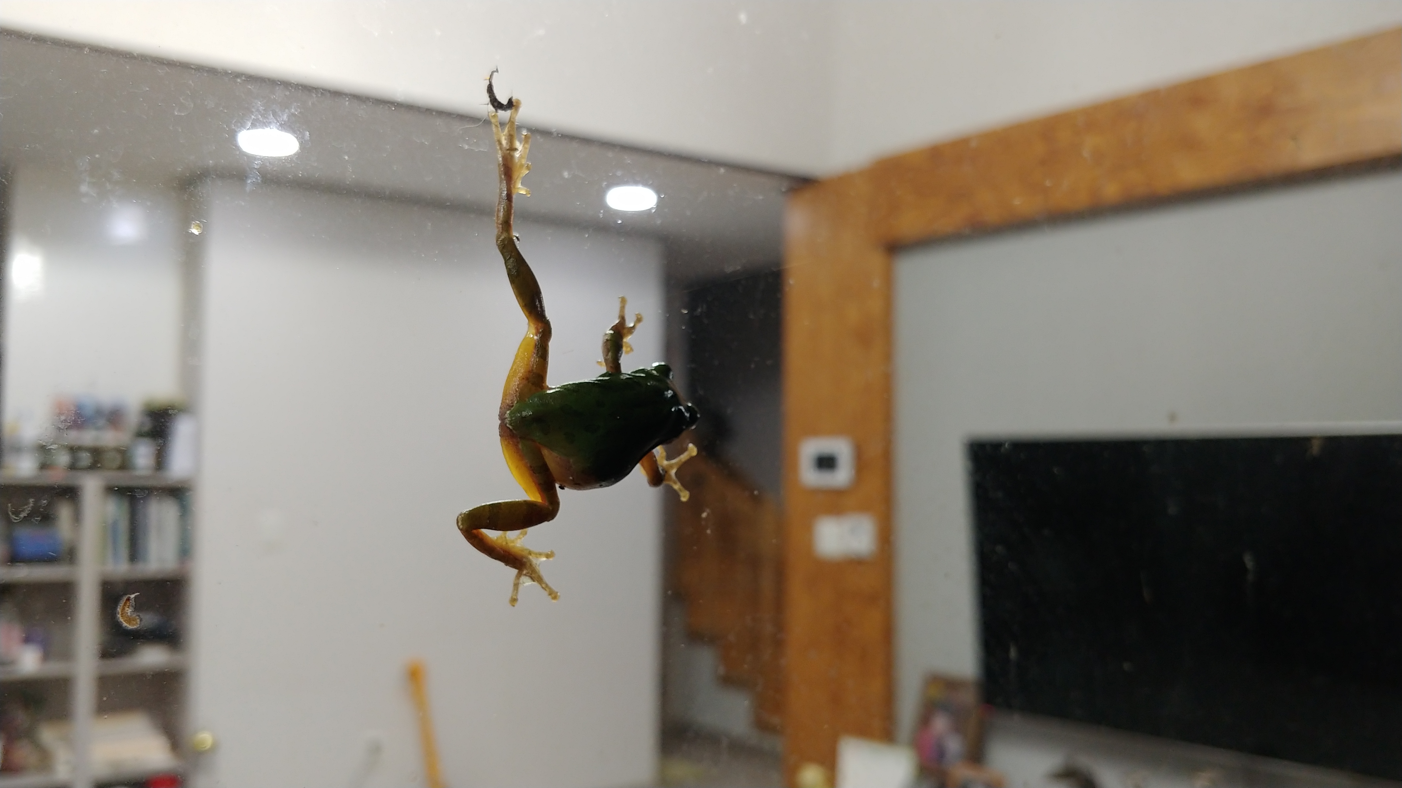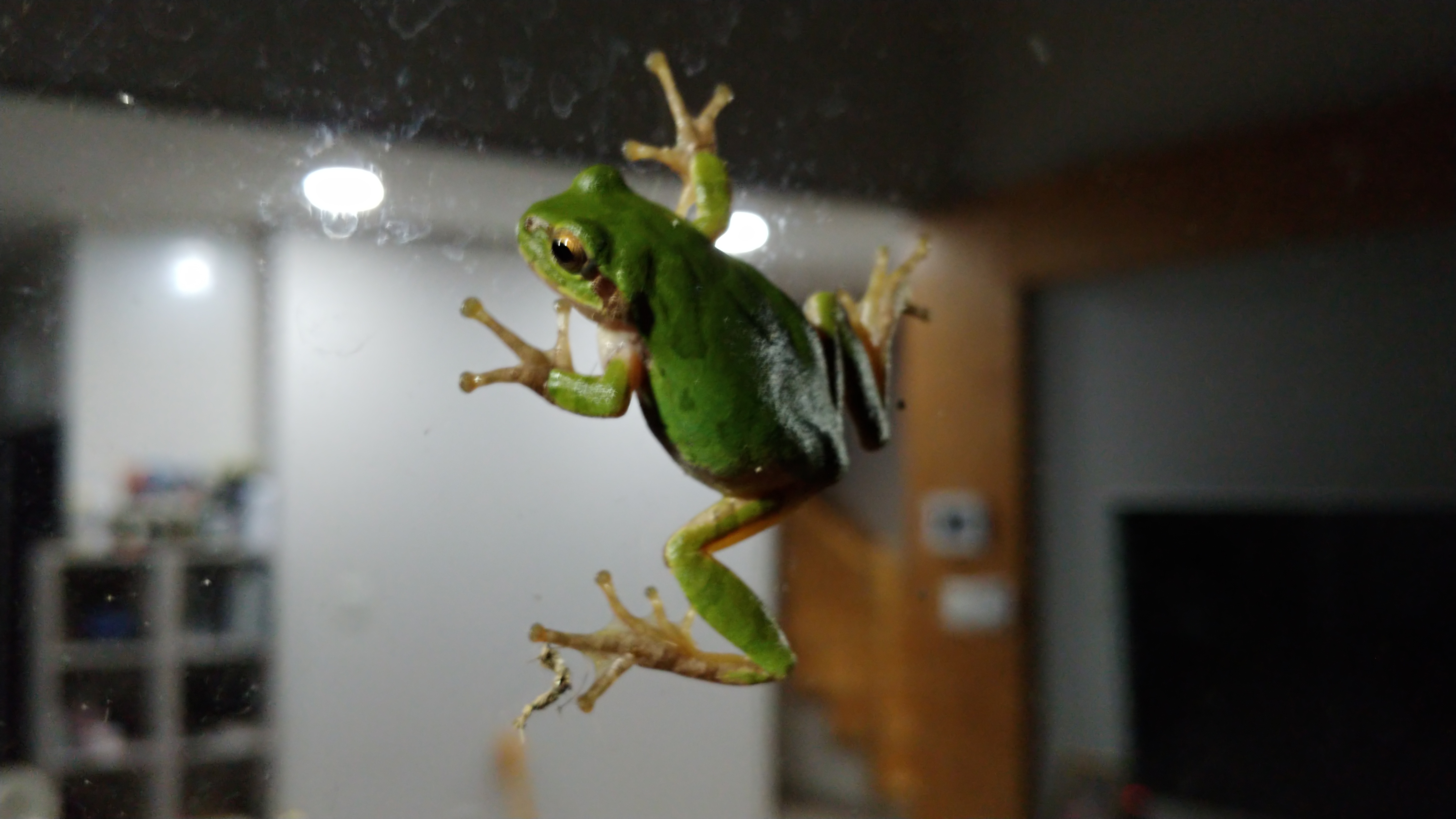 청개구리 한 마리가 거실 유리창에 붙어 기어 오릅니다.