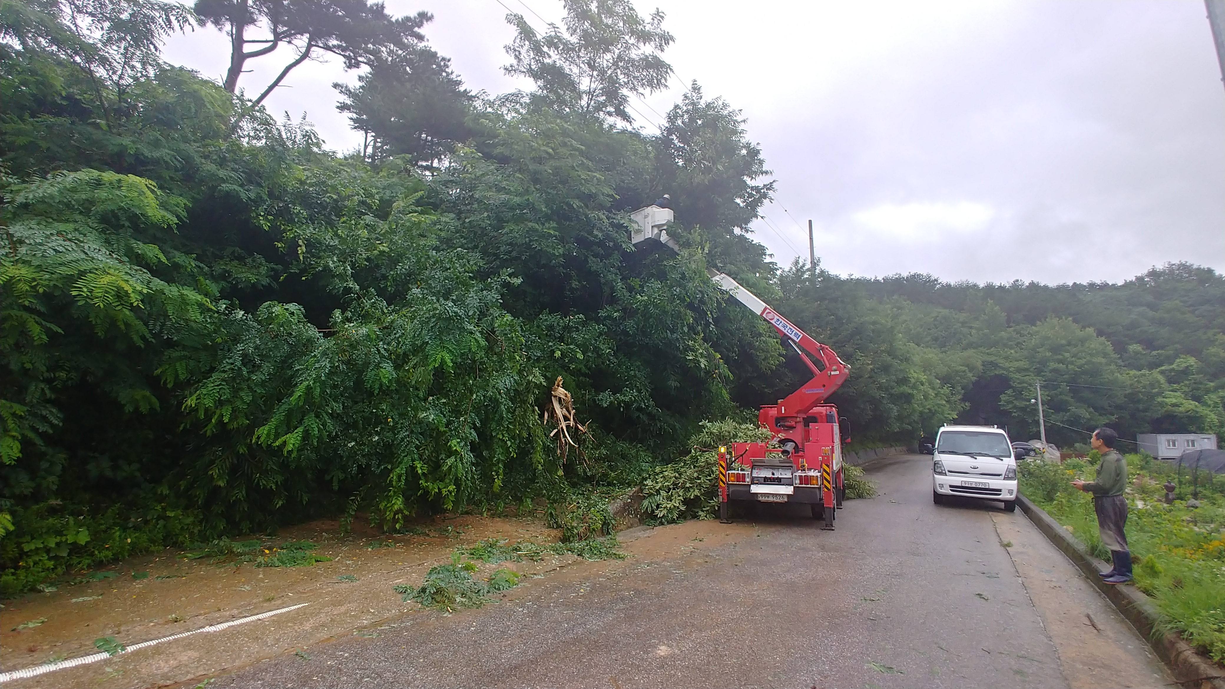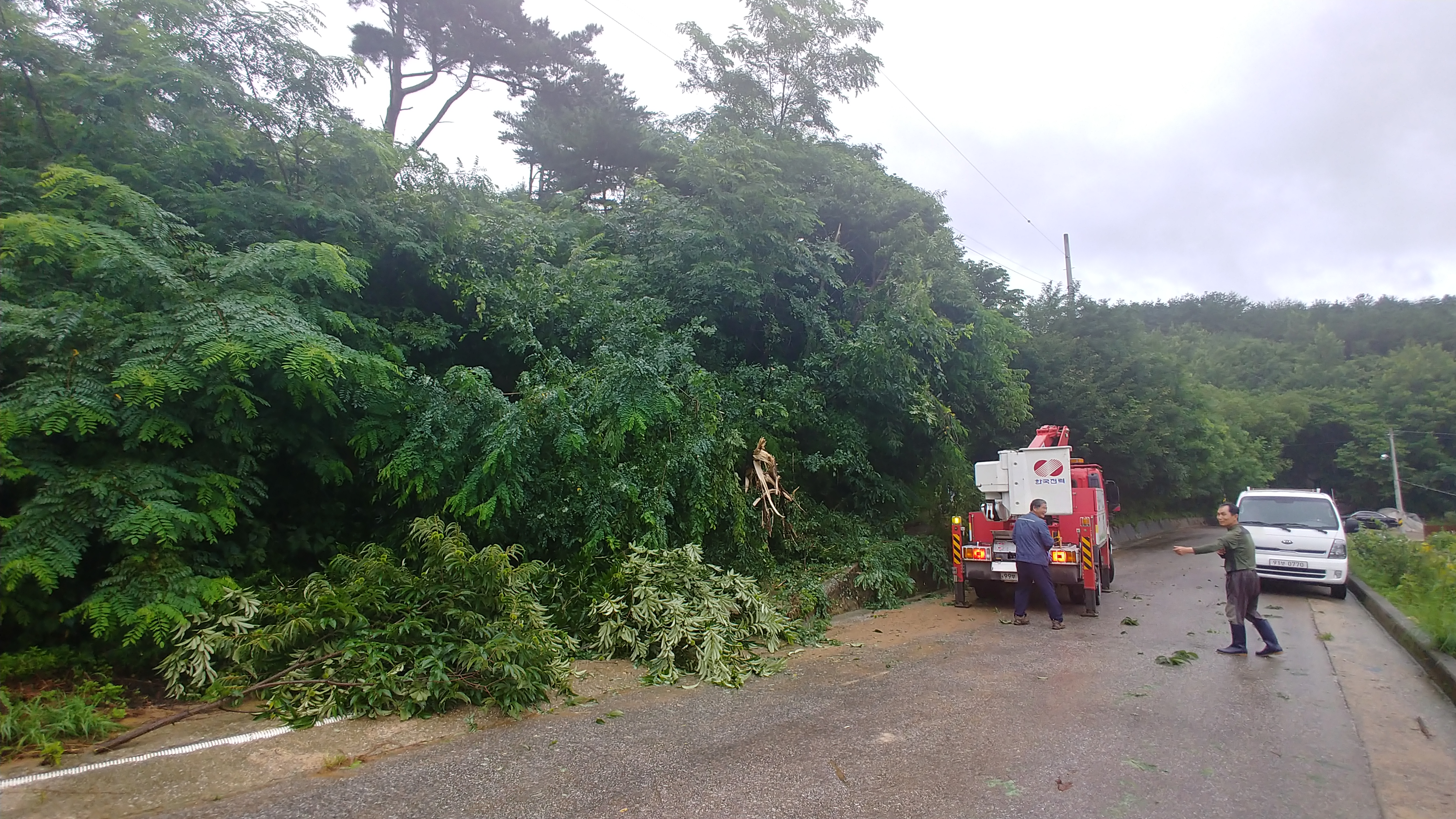 한전에서는 전깃줄에 걸린 나뭇가지를 잘라내고, 행정공무원은 산사태 실사를 하였습니다.