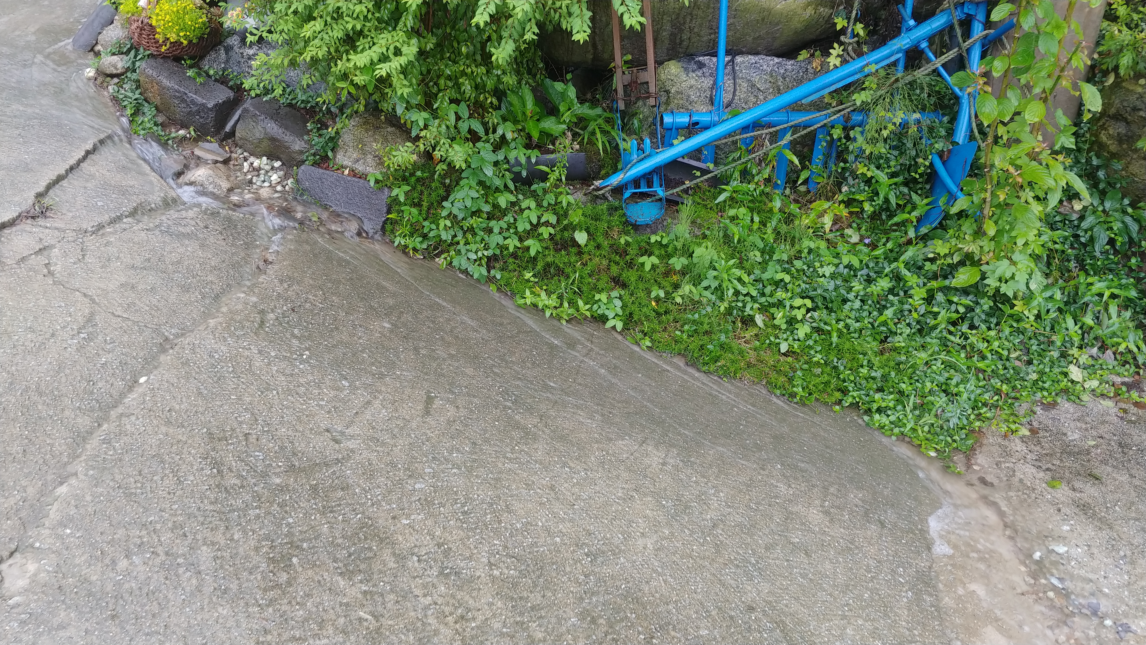 시간당 너무 많은 비가 내린 탓도 있지만, 도로 포장이 구배가 맞지 않아 도로 노면 높낮이 문제로 농장 안으로 빗물이 흘러 들어온다는 것이 문제입니다.