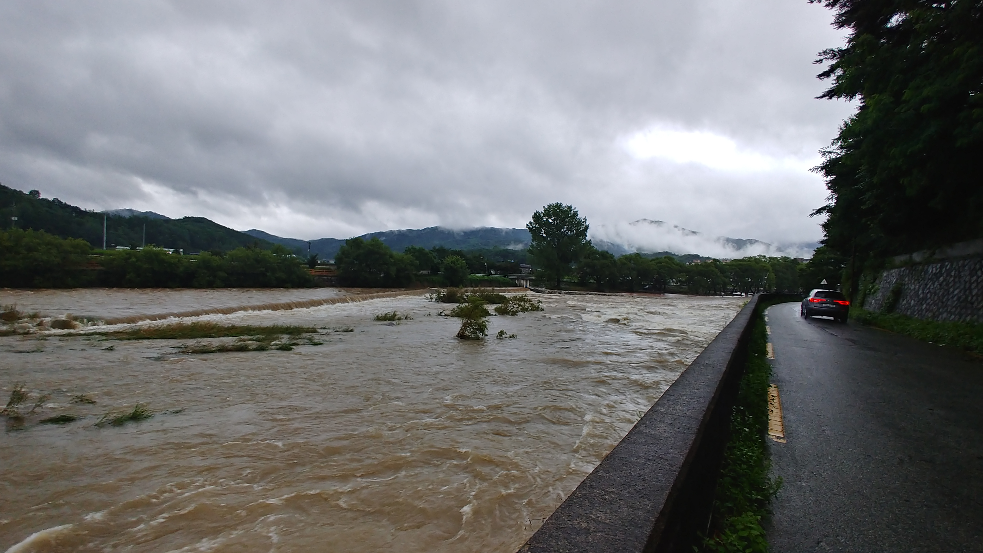 이날 인근 지역인 안의면 안심마을 지우천에도 엄청난 물이 불어 났습니다.