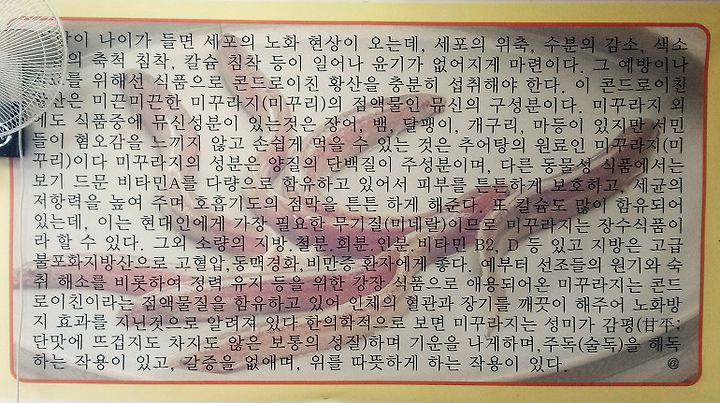 사람이 나이가 들면 세포의 노화현상이 오는데, 세포의 위축, 수분의 감소, 색소의 축척 침착, 칼슘 침착 등이 일어나 윤기가 없어지게 마련이다. 그 예방이나 치료를 위해선 식품으로 콘드로이친 황산을 충분히 섭취해야 한다. 이 콘드로이친 황산은 미끈미끈한 미꾸라지(미꾸리)의 점액물인 뮤신의 구성분이다. 미꾸라지 외에도 식품 중에 뮤신성분이 있는 것은 장어, 뱀, 달팽이, 개구리, 마 등이 있지만 서민들이 혐오감을 느끼지 않고 손쉽게 먹을 수 있는 것은 추어탕의 원료인 미꾸라지이다.
