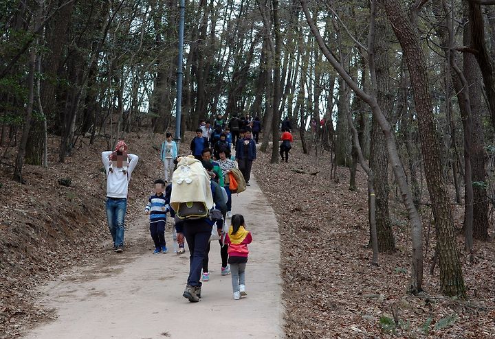 주차할 공간을 찾아 겨우 주차하고 언덕길 진입로에 들어섰다. 수많은 인파가 시멘트 포장길을 오른다. 어깨에 아이를 태우거나 베이비 캐리어에 아이를 엎은 채, 수난(?)을 당하는 아빠들의 사랑스런 모습이 정겹다. 지난해까지만 해도 비 포장된 진입로는 말끔히 포장이 돼 있다. 봄철 이 시기에 많은 사람들이 찾다보니 행정에서 주민건의사항을 받아들인 것 같다. 봄철 황사의 영향인지 날씨가 그리 맑지는 않다.
