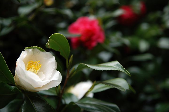 짙게 바른 립스틱보다 더 붉은 동백이 꽃을 피웠다. 노란 수술대가 붉은 색과 대조를 이룬다. 햇살에 역광으로 비치는 꽃잎. 동백꽃이 이처럼 아름답게 보이는 것도 드물게 느껴진다. 바로 옆에는 흰색 꽃을 피운 동백나무가 있다. 동백나무 종류도 수백 종이 넘는 것으로 알려졌지만, 이처럼 흰색 동백꽃을 보기란 흔하지 않다. 탐스러운 모습으로 순백의 아름다움을 뽐낸다. 그 옆으로는 접을 붙여 피운 꽃인지, 흰색과 붉은 색이 섞인 동백꽃이 눈에 띈다. 화려한 모습으로 치장하고 있다.