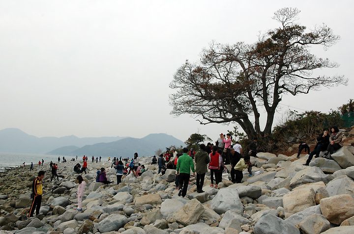 갯가 몽돌 밭에는 많은 여행자들이 저마다의 즐거움에 빠져있다. 한가롭게 낚시를 즐기는 사람이지만, 속마음은 언제쯤 고기가 입질을 할지 궁금해 할 터다. 큰 텐트를 치고 봄 햇살을 피해 누운 젊은 남녀는 무슨 생각을 할까. 동몽이상일까, 이상동몽일까. 계모임으로 보이는 여러 사람은 고기 굽기에 여념이 없다. 먹는 즐거움에 푹 빠진 여행자들은 아름다운 풍경에는 관심도 없는 것만 같아 보인다. 푸른 바다를 가르고 통통거리며 지나가는 어선은 제 갈 길이 바쁜 모양이다. 갈매기 떼가 배를 따라 나는 걸 보면 아마도 만선을 했나 싶나 싶기도 하다. 할머니는 고동 줍기에 바쁘고, 손자는 할머니가 주운 고동을 건네받고 혹여 놓칠세라 두 손에 꼭 쥐고 있다. 이 모두가 공고지에 여행 온 사람들의 풍경이다.