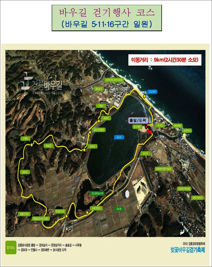 걷기구간은 바우길 5구간, 11구간, 16구간 일원 9km에 걸쳐 진행되며,