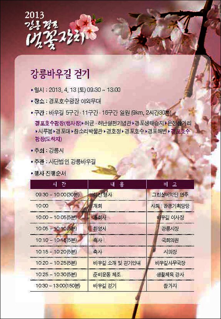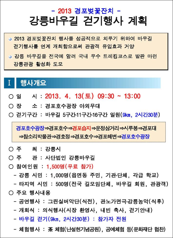 2013 경포벚꽃잔치 행사를 성공적으로 치루기 위해 바우길 걷기행사를 개최한다고 합니다.