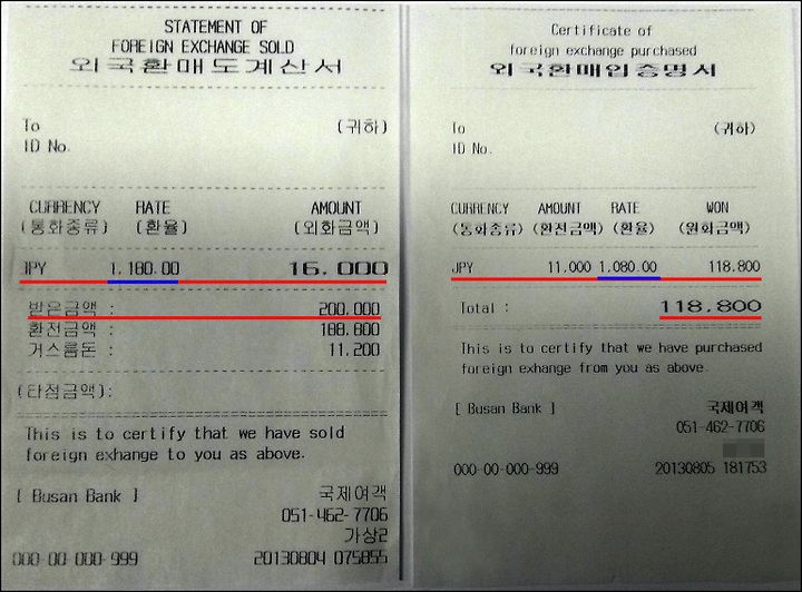 당초 환전한 16,000엔 중 5,000엔을 제한 나머지 11,000엔은 한국 돈으로 환전하니 118,800원을 내어 주더군요.