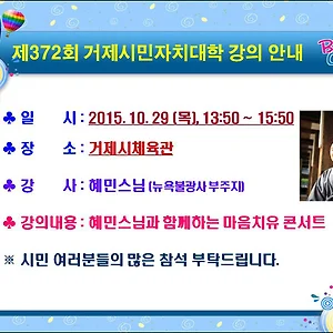 혜민스님2 [나의 부처님] 사랑과 존경, 혜민스님/오늘의 법문 [나의 부처님] 사랑과 존경, 혜민스님/오늘의 법문 보은 법주사 마애여래의좌상(보물 제216호). [나의 부처님] 사랑과 존경, 혜민스님/오늘의 법문 사랑과 존경/ 혜민스님 며칠 전 어렸을 때 참으로 친하게 지냈던 속가의 사촌 동생으로부터 결혼을 한다는 이메일을 받았다.방학 때마다 외할머니가 계신 외갓집에 모여 어깨동무하면서 재미있게 놀던 때가 바로 어제 같은데 벌써 결혼을 한단다. 지금은 미국에 있는데다 또 출가한 몸이라 직접 결혼식장에 가서 축하는 못 해 주지만 멀리에서나마 그 동생을 위해 그리고 올 봄에 결혼하는 많은 젊은 부부들을 위해 도움이 되는 말이라도 한마디 해주고 싶다. 결혼하는 부부들에게 사람들이 해주는 말들은 대체로 사랑이라는 명제에 포커스가 맞추어져 있다.머리가 파뿌리가 되도록 사랑하.. 2016. 2. 28. [거제도여행] 혜민스님과 함께하는 마음치유 콘서트/거제여행/거제여행코스/거제도여행코스/거제가볼만한곳/거제도가볼만한곳/시민자치대학 [거제도여행] 혜민스님과 함께하는 마음치유 콘서트 /거제여행/거제여행코스/거제도여행코스/거제가볼만한곳/거제도가볼만한곳/시민자치대학 [거제도여행] 혜민스님과 함께하는 마음치유 콘서트 /거제여행/거제여행코스/거제도여행코스/거제가볼만한곳/거제도가볼만한곳/시민자치대학 혜민스님. 아마도 많은 사람들이 혜민스님을 알고 있으리라는 생각입니다. 또한 혜민스님의 법문이나 특강을 들은 분도 많으리라 생각합니다. 이처럼 이름이 널리 알려져 있는 혜민스님이 거제도를 찾는다고 합니다. 오는 10월 29일(목) 오후 거제시에서 실시하는 거제시민자치대학에 특별강사로 초청돼 오신다고 합니다. 강의는 '혜민스님과 함께하는 마음치유 콘서트'라는 주제로 열립니다. 이번 강의는 많은 사람들이 몰려들 것으로 예상하여 평소 강의하던 청소년수련.. 2015. 10. 28. 이전 1 다음